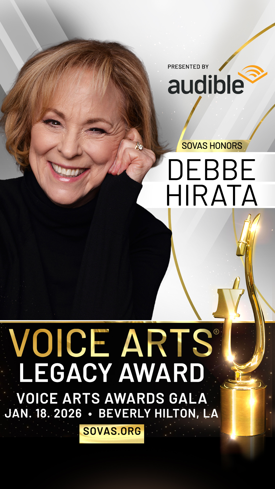 -- The Voice Arts Legacy Award, presented to long-time voice actor Debbe Hirata by voice actor/coach Dave Walsh. The award "honors an individual whose voice has transcended performance to become a lasting cultural force. It recognizes a lifetime of extraordinary contribution to the art, craft, and power of voice across entertainment, media and society. Recipients embody excellence, influence and timeless impact, with a legacy that continues to inspire artists and audiences worldwide." SOVAS Senior Vice President Joan Baker adds: "When Deb’s sizzle reel played and she went onstage to accept her award, she received a standing ovation from the entire audience. Among the most enthusiastic applauders were Laurence Fishburne and James Earl Jones’s son, Flynn Earl Jones. They were clapping the loudest."