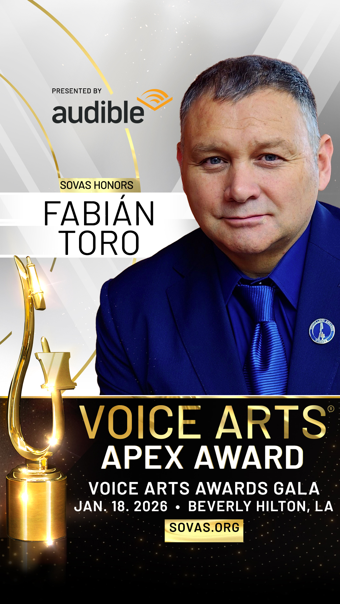 -- The Voice Arts APEX Award, presented to Ecuador voice actor Fabián Toro by SOVAS Chairman/CEO Rudy Gaskins. The award recognizes an "individual whose body of work represents the pinnacle of achievement in the voice arts. Often presented to members of a younger generation, it honors voice actors who have reached a remarkable summit early, and whose work continues to shape what the industry can become.”
